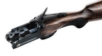 Вертикальное двуствольное ружье 12 калибра от Sauer. Оружие имеет черную ствольную коробку с гравировкой "Sauer & Sohn". Приклад и цевьё - из тёмного ореха.